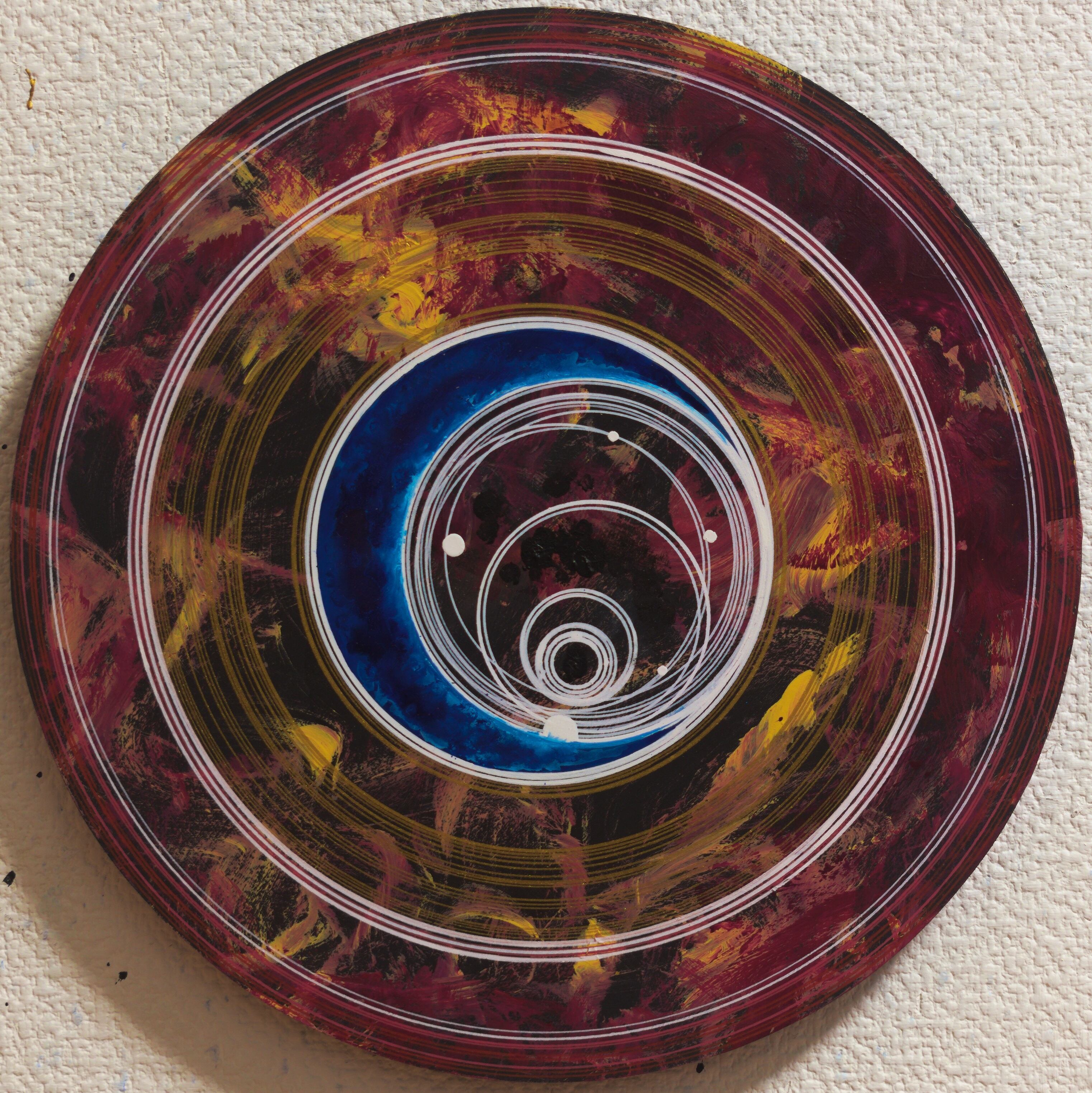 シナの木材を円形に加工してアクリル絵の具で描いた108点の円形抽象画連作、